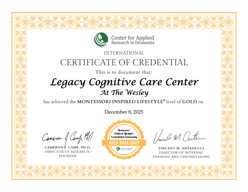 [HUTCHINSON, 12-11-2025]—The team at The Wesley is devoted to building a Montessori Inspired Lifestyle® for their community, earning them the highest Gold Level credential. The MIL program was created by the Center for Applied Research in Dementia (CARD) after one of its founders, Dr. Cameron Camp, adapted Dr. Maria Montessori’s principles for older adults with dementia. Guided by CARD, staff learned how to implement the Montessori principles of equality, dignity, and respect into their community. Staff were trained to empower residents with memory impairment to be as independent as possible. This is achieved through tapping into each resident’s remaining strengths, designing environments they can thrive in, and helping them find purposeful activities and meaningful roles within their community.